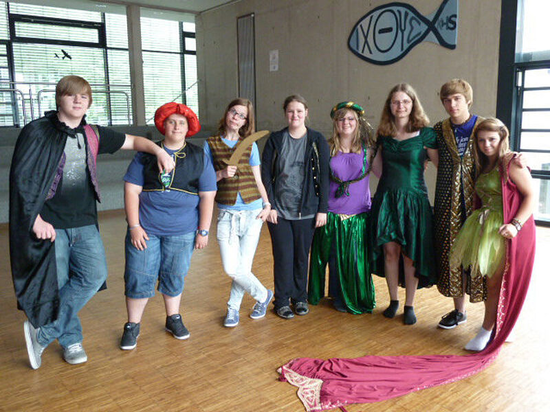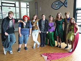 Parallel zu den Tanzproben entwickelte und fertigte eine Kunstgruppe unter der Leitung von Frau Küpper in einem Unterrichtsprojekt das Bühnenbild. Die Kostüme stellte die Kollegin aus ihrem Karnevals-Fundus zur Verfügung.